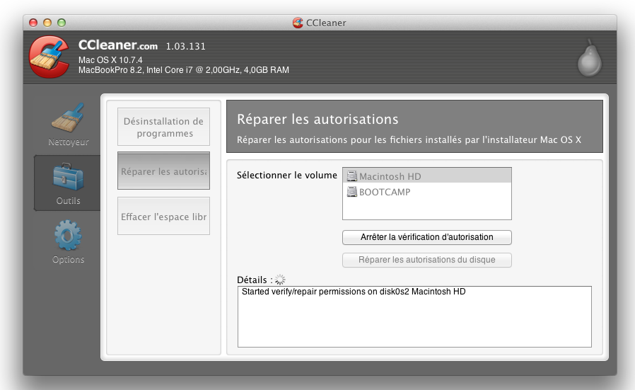 CCleaner propose également une fonctionnalité souvent recommandée pour les utilisateurs de Mac: réparer les autorisations. Si cette fonctionnalité est accessible sur votre Mac par défaut, elle peut néanmoins être difficile à trouver pour un novice. Ainsi, si vous n’avez pas le courage de chercher dans les méandres de votre Mac où se trouve la réparation des autorisations, vous pourrez passer par cette application.