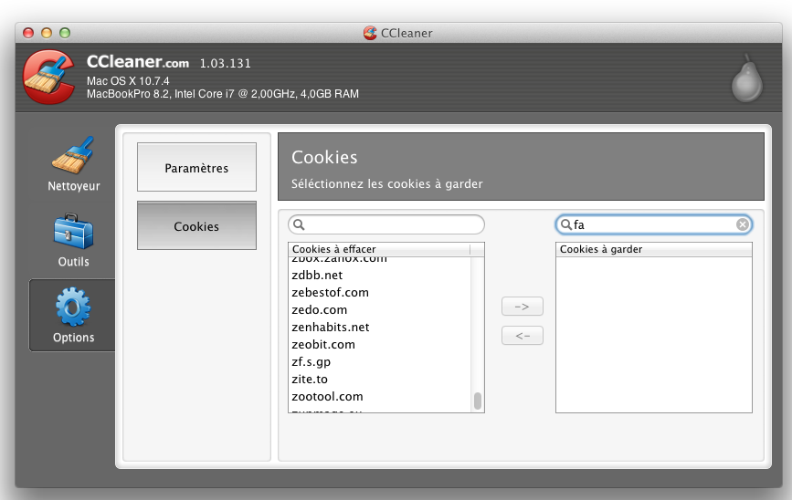 Enfin, une option bien plaisante va vous permettre d’affiner votre nettoyage en sélectionnant les cookies à conserver. Vous pouvez ainsi garder, lors d’un nettoyage, les cookies de votre choix, comme ceux de Facebook, ou encore votre compte Gmail.