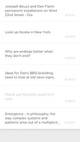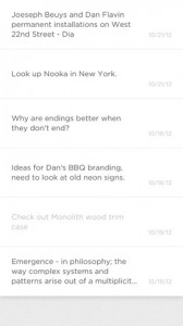 Ainsi, par la suite, retrouverez-vous l’ensemble de vos notes sous forme de liste. Mais il faut savoir que SquareSpace Note n’est pas qu’une simple application « copie » de Notes. En fait, lorsque je vous parlais « d’envoyer » la note, il fallait le prendre au sens propre. Car cette application vous permet en effet de lier vos comptes Mail, Dropbox, Twitter, Facebook, Evernote, ou encore Squarespace si vous souhaitez en créer un, pour que d’un slide vous puissiez y envoyer les notes de votre choix. Bien sûr, si vous ne souhaitez pas envoyer toutes vos notes au même endroit, cela est également possible. Il vous suffit de définir quels sont les réseaux où vous souhaitez envoyer vos notes par défaut (s’il y en a), ou de cliquer sur une note pour accéder à l’ensemble des choix possibles.