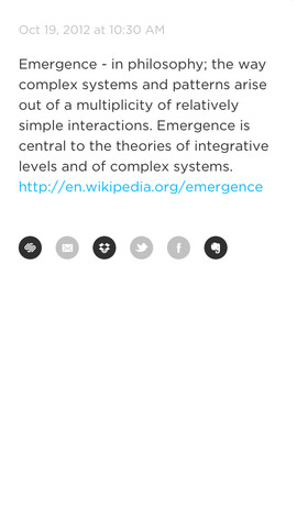 En effet, après avoir sélectionné une note, vous verrez apparaître en bas de celle-ci un ensemble d’icônes représentant les différents réseaux. En un clic, vous pouvez sélectionner le réseau vers lequel envoyer la note, et même visualiser ceux où elle a déjà été envoyée (les icônes étant noircies). A noter que, dans les réglages, vous pouvez également définir si vous souhaitez partager le lieu où la note a été prise, mais aussi choisir, pour un email, de définir un objet un extrait de la note ou bien un objet personnalisé.