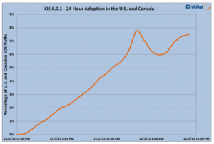 L’iOS 6.0.1 est disponible que depuis quelques jours, et le taux d’installation évalué par Chitika (évaluation effectuée moins de 24h après la sortie de la mise à jour) est de 7,5%.