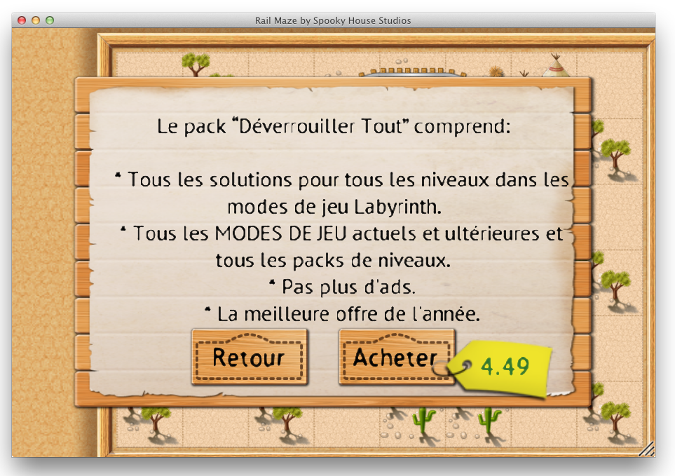 Si le jeu vous plaît vraiment, sachez qu’il n’est pas nécessaire de débloquer chaque « bonus » (solutions, modes supplémentaires, etc.) individuellement: vous pouvez acheter le pack « Déverouiller Tout » pour 4,49€. En somme, pour profiter du jeu pleinement, il vous faudra le concevoir comme un jeu payant.