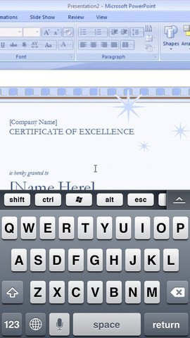 On retrouve également en bas de l’écran une languette: si vous ne la touchez qu’une fois, vous ferez apparaître le clavier virtuel, avec des raccourcis pour toutes les touches manquantes pour simuler celles d’un ordinateur. Si vous la touchez deux fois, vous accéderez au menu de l’application. Il faut toutefois noter que l’éditeur propose l’accès à votre ordinateur depuis n’importe quel endroit, y compris en 3G, au sein d’un achat in-app. Néanmoins, l’utilisation sur un même réseau wifi reste entièrement gratuite, ce qui vous permet de profiter de toutes les fonctionnalités chez vous, ou bien lors d’une présentation par exemple.