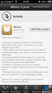 La seule nouveauté de cette mise à jour 3.0.2 et de corriger certains bugs, survenus suite à la sortie de la version 3.0, et qui pouvaient entrainer la fermeture de l’application chez certaines personnes.. Une petite mise à jour certes, mais iBooks en avait réellement besoin pour rester au top.
