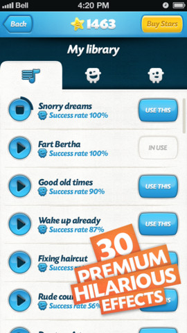En effet, le principe de l’application est vraiment simple: juste avant de prendre la photo, l’application déclenche un son « rigolo » (ou parfois surprenant: j’ai pour ma part été assez surprise par « Laugh symphony in D-minor »), censé faire faire une tête drôle à vos amis donc, afin d’obtenir une photo un peu plus animée que d’habitude. Comme dans bon nombre de ce genre d’applications, vous n’aurez au départ que quelques sons et devrez débloquer le reste.