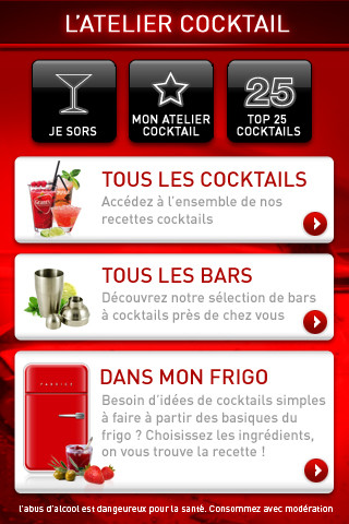Vous allez en effet pouvoir découvrir les recettes de plus de 200 cocktails, tous plus appétissants les uns que les autres. Vous pouvez choisir de les découvrir sous forme de liste (par nom, par ingrédients, etc.), de rechercher les 25 mieux notés, ou bien d’entrer dans la rubrique « Dans mon frigo », afin de pouvoir renseigner vos différents alcools, softs ou encore aliments disponibles, afin que l’application cherche automatiquement les cocktails que vous pouvez rapidement réaliser avec ces derniers.