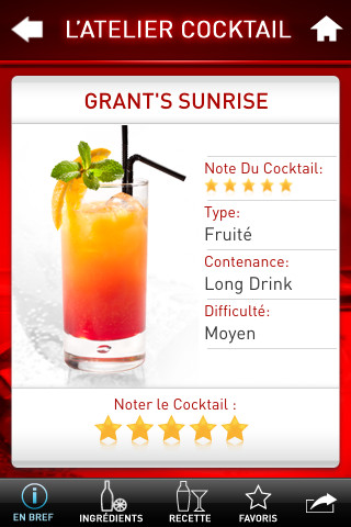 Aujourd’hui, je suis très contente de vous présenter cette application. En effet, je l’utilisais bien avant que nous décidions de vous la présenter sur App4Phone, et je trouve qu’il s’agit là d’une application de très bonne qualité, et qui plus est gratuite. En effet, Atelier Cocktail (Télécharger sur l’App Store) a tout pour plaire aux amateurs de Tequila Sunrise, Sex on the Beach ou encore Black Russian ou Mojito, puisqu’elle contient toutes vos recettes favorites.