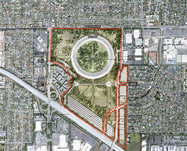 Les nouveaux plans du projet ont été publiés ce mercredi 21 Novembre sur le site de la municipalité de Cupertino. Ce dernier s’appelle Apple Campus 2 et ressemble à un anneau géant entouré de 7 000 arbres qui formeront un vaste parc. Ce projet représentera plus de 260 000 m² de surface (contre 79 000 m² actuellement) et accueillera près de 12 000 salariés. En outre des vastes bâtiments regroupés en anneau et du parc, Apple intégrera à son projet des places supplémentaires pour son parking ainsi qu’un amphithéâtre qui a été déplacé de son endroit initial.