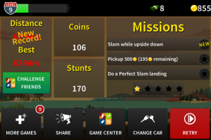 Appuis simultanément sur les deux zones qui font tourner la voiture quand tu es en l’air. J’ai vu dans le Game Center des sauts de plus de 2 millions en longueur. C’est possible ça ? Et avec quelle voiture Même avec « The Peak » je ne dépasse pas les 1200m