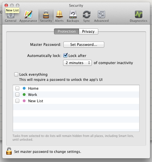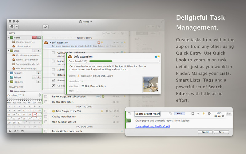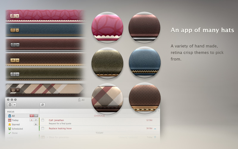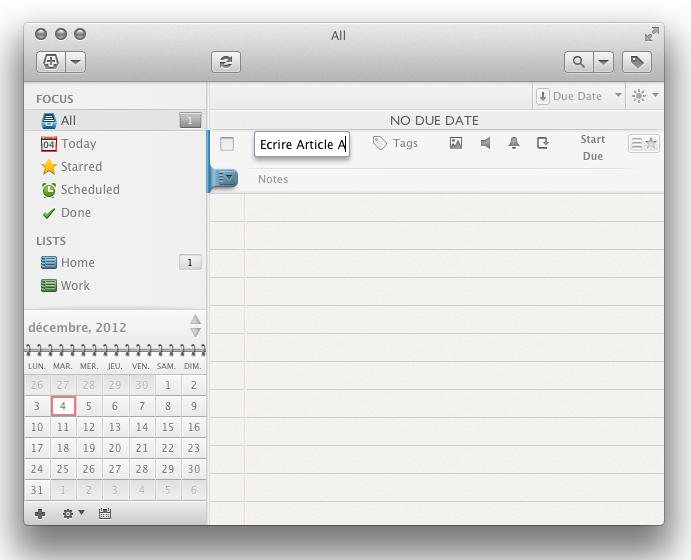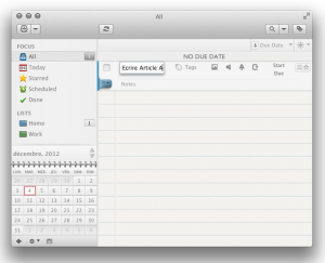 Premièrement, 2Do dispose d’une interface graphique absolument parfaite: elle s’intègre parfaitement dans l’environnement Mac OS, propose un mode plein écran de toute beauté, et est apparemment compatible avec l’écran Retina des nouveaux MacBook (qui m’en offre un pour que je puisse le confirmer?). Il n’y a vraiment rien à redire, tout est sobre mais fonctionnel à la fois, et je pense que ces graphismes conviendront à bon nombre d’entre vous.