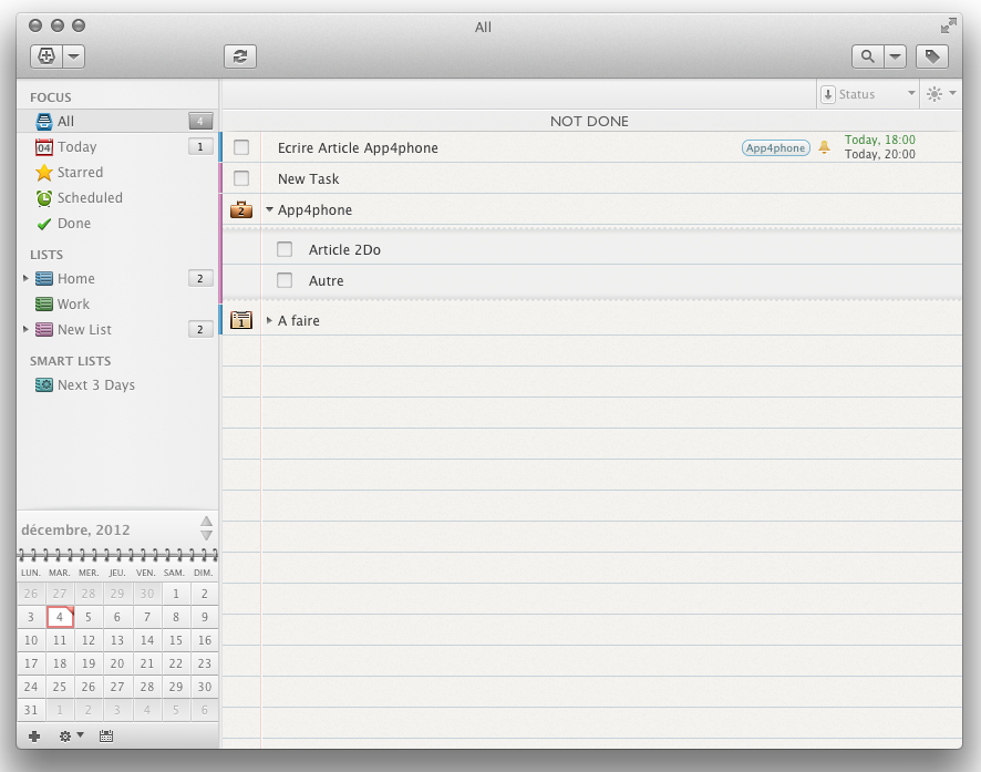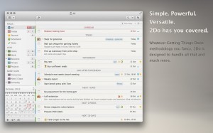 Attention, aujourd’hui pour l’App4Mac, nous avons le droit à un invité de poids. Nous vous avions en effet déjà parlé de 2Do sur App4Phone, mais voici maintenant la version Mac: du lourd, du très lourd, puisqu’il s’agit tout de même de l’un des meilleurs planners disponibles sur l’AppStore, rien de moins. En effet, 2Do est probablement l’un des gestionnaires de tâches les plus complets, et peut aussi bien être utilisé pour un usage professionnel que personnel, voire mixte.