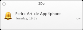 Si vous avez choisi de définir une alerte, vous recevrez des notifications à l’heure indiquée dans le coin de votre Mac, vous permettant de ne plus jamais rien oublier. Attention toutefois, il faut que 2Do soit ouvert, ou bien que vous ayez indiqué dans les préférences que vous souhaitez lancer 2Do Helper au démarrage du système, une mini app démarrant automatiquement en fond, vous permettant de bien recevoir toutes les alertes nécessaires.