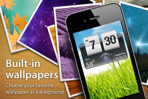 L’application détecte automatiquement votre localisation, mais si vous le désirez, vous pouvez aussi rentrer celle-ci manuellement. Dès lors, une petite icône en-dessous de l’heure vous permet de voir en un clin d’œil la météo à l’extérieur. En touchant celle-ci, la fenêtre se déroule et laisse apparaître la météo sur les 4 jours à venir, avec également une indication des températures. Un petit bouton vous permet également de switcher à la rubrique « Alarmes ». La principale originalité de cette application réside dans le fait que vous pouvez choisir d’instaurer un fond d’écran changeant en fonction du temps. Néanmoins, si vous préférez un fond plus traditionnel, l’icône météo suffit largement, mais vous devrez tout de même choisir parmi ceux proposés par l’app.