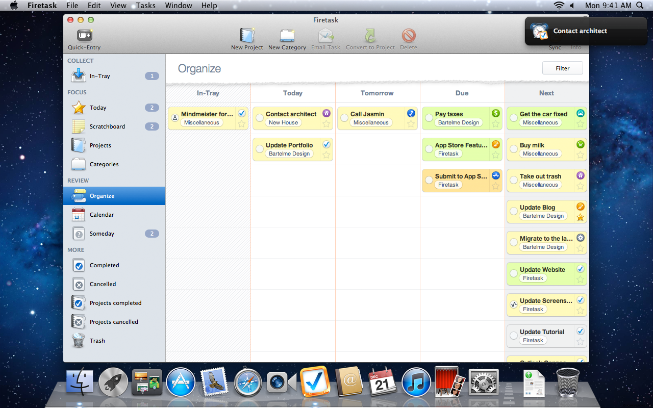 Mais Firetask possède également une fonctionnalité que j’apprécie particulièrement: « Organize ». Cette option magique vous permet de créer une sorte de tableau très visuel de toutes vos tâches à venir. Il est alors très facile de modifier l’ordre de ses tâches, et d’avoir une vue d’ensemble de ce qui nous attend le jour même, le lendemain, ce qui est en retard ou ce qui reste à venir. Vous pourrez alors faire glisser des tâches de la rubrique « Next » à « Today » par exemple, vous permettant vraiment de vous organiser comme bon vous semble.