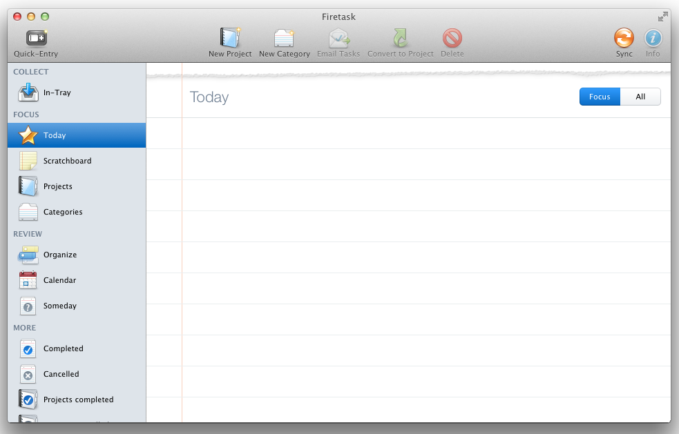 Une fois votre application un peu plus remplie, on visualise mieux l’intérêt de l’application: tout est clair et bien organisé, on sent immédiatement que l’on peut s’y retrouver. A gauche de la tâche, on retrouve une case à cocher lorsque celle-ci est terminée. A droite, la date d’échéance, la priorité, mais également la possibilité d’ajouter une tâche aux favoris. On note alors quelques éléments pratiques, tels que le bouton « Focus », en haut à droite, permettant de ne montrer que les tâches à venir, ainsi que la première tâche à effectuer dans chaque projet. Si l’échéance d’une tâche est déjà passée, l’icône de cette dernière est alors « cerclée de feu », pour la repérer rapidement. Il est également possible d’utiliser la barre de navigation sur le côté pour afficher vos tâches par projet, ou bien par catégories. Si vous ne savez pas encore quand effectuer une tâche, vous n’aurez qu’à la ranger dans la rubrique « Someday », et si vous souhaitez la supprimer définitivement, la corbeille sera votre amie.