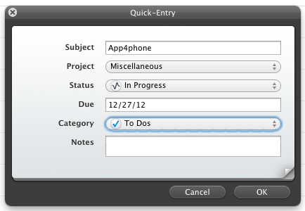 Une petite fenêtre apparaît alors, vous permettant de donner à votre tâche un nom, de l’associer à un projet, de lui affecter un statut, une date d’échéance, une catégorie, ou encore des notes.