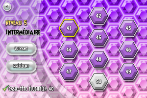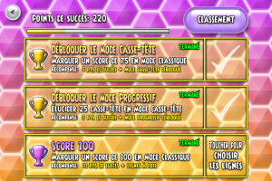 – Le mode Casse-tête. Ici, toutes les cases sont déjà remplies. Il vous faut changer les pièces du puzzle de place afin de réaliser l’objectif imposé. Ce sont bien 100 niveaux qui sont disponibles ici et croyez-moi, c’est loin d’être évident.