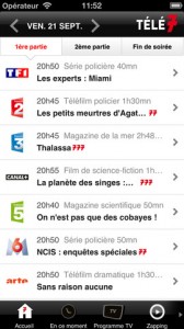 Pour commencer, l’application va vous proposer de charger les programmes de la semaine, mais aussi d’activer ou non le téléchargement automatique. Premier point positif pour cette app donc qui va stocker les programmes dans votre iDevice pour les rendre accessibles hors connexion. Ensuite, l’accueil nous permet de visualiser en un coup d’œil le programme de la soirée sur les grandes chaînes. Il est également possible de switcher rapidement vers les jours suivants en utilisant les flèches en haut.