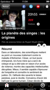 Pour obtenir plus de détails sur l’émission qui vous intéresse, un simple tap: on retrouve alors l’heure de diffusion, la durée, de plus amples détails sur l’épisode en question ainsi qu’un résumé, le casting ou encore des photos. Fait appréciable: deux petits boutons en forme de « A » vous permettent de réduire ou d’augmenter la police pour une meilleure lisibilité. On retrouve également la possibilité d’instaurer un rappel (bouton en forme d’horloge en haut à droite) pour recevoir une notification avant que le programme ne commence.