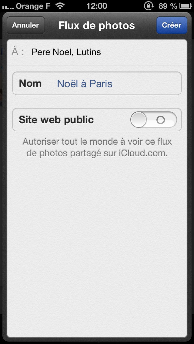 Pour ce faire, rendez-vous dans l’application native photo, onglet flux de photos et cliquez sur le bouton +, situé en haut à gauche, pour créer un nouveau flux de photos. Vous devez ensuite renseigner un titre, le caractère public/privé et les destinataires de ce flux de photos.