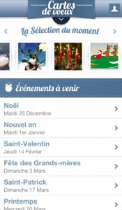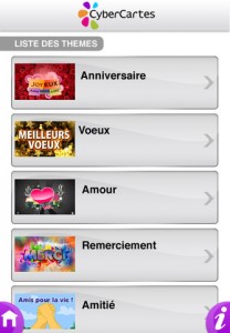 CyberCartes est une application un peu plus originale, car elle vous permet d’envoyer des cartes de voeux au format vidéo. Plusieurs catégories sont également présentes (anniversaire, Noël, nouvelle année, …) et plusieurs modèles s’offrent ainsi à vous. L’envoi de la carte se réalise par email, Facebook. La géolocalisation (pour afficher l’heure, la date, et le lieu d’envoi) est comprise afin de surprendre encore plus vos amis.