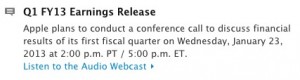 A la fin du mois de janvier, précisément le 23 janvier, Apple présentera les résultats de son premier trimestre fiscal 2013 (Q1). Pour les débutants en comptabilité, ce trimestre s’étale d’octobre à décembre 2012 et permet de conclure sur la réussite ou non de la période de Noël.