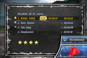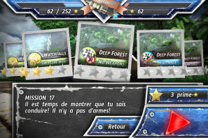 Pour progresser dans le jeu, il vous faudra obtenir le plus d’étoiles possibles. La médaille d’or apporte 4 étoiles, celle d’argent 3 et ainsi de suite. Vous piloterez évidemment grâce au Gyroscope de votre iJoujou. Mais vous pouvez également changer cette commande pour ceux qui préfèrent avoir les touches directionnelles. L’accélération se fait d’elle-même et une pédale de frein est disponible en bas à droite. L’utilité de cette dernière est quand même discutable… Elle ne m’a servi que dans un seul type de course que je vous laisserai découvrir par vous -même 😉