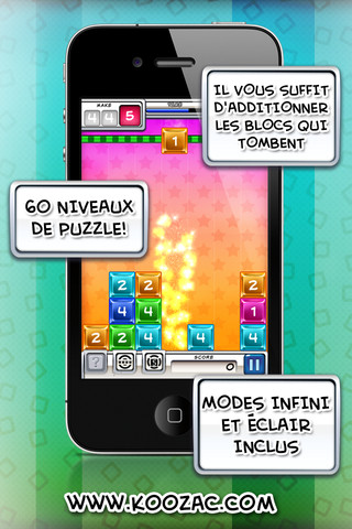 Cette semaine, l’application de la semaine, temporairement gratuite, sélectionnée par Apple, est le jeu Koozac. Dans ce jeu de puzzle, des cubes numérotés tombent et il faut détruire les pièces grises pour gagner la partie. Pour cela il suffit d’empiler les cubes selon leurs chiffres : un total est attendu et les cubes disparaissent si la somme de leurs chiffres est égale à l’objectif annoncé.