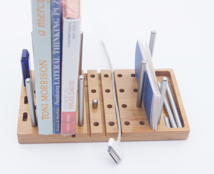 Comme vous pouvez le voir sur la photo ci-dessus, les possibilités sont multiples et Modo est vraiment modulable. Il suffit d’organiser les tiges d’aluminium pour les usages que vous souhaitez : support d’iPhone, d’iPad, pot à crayon, vos cartes de visite, tout se range astucieusement. Il y a même des tranchées dans le bois pour vos câbles et des trous aux dimensions des prises USB !