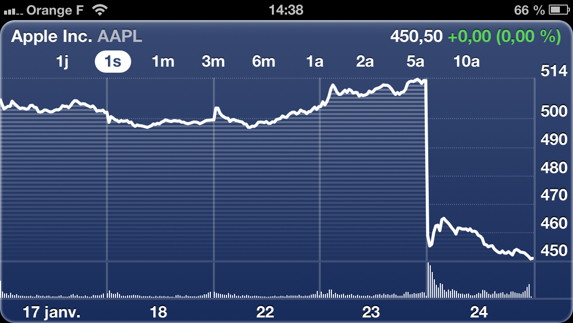 Séance catastrophique, Apple n’avait pas connu une telle baisse depuis le 20 septembre 2008 avec la crise financière. Même si Apple a mis en avant ses ventes exceptionnelles d’iPhone et d’iPad avec une hausse du chiffre d’affaires. C’est le bénéfice qui a stagné à 13 milliards de dollars, la marge brute s’est ainsi grandement réduite pour Apple, la faute principalement au succès de l’iPad Mini. Le marché est de plus en plus saturé et la concurrence fait rage.