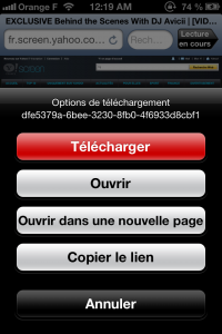 Pour télécharger une vidéo, c’est la même chose. Touchez et maintenez la touche « Lecture » de la vidéo puis choisissez l’option « Télécharger ». Toutefois, j’ai une mauvaise nouvelle… YouTube n’est pas pris en charge. L’éditeur nous explique pourquoi : « iDownloader Pro ne prend pas en charge YouTube en raison de ses conditions générales d’utilisation qui interdisent le téléchargement de vidéos depuis son site web. A l’heure actuelle, il n’existe aucun programme de téléchargement qui puisse télécharger des fichiers sur YouTube. Si leurs conditions venaient à changer, nous ajouterions immédiatement cette prise en charge ». Voilà, le ton est donné mais les raisons sont discutables. L’application iDownloader Pro (Mais pas la même) by AppBank cette fois permet d’obtenir des vidéos depuis YouTube. A télécharger ici pour 0,89€. A voir si ça marche aussi !