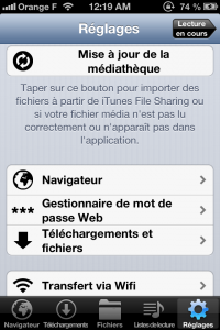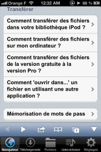 Pour télécharger de la musique, c’est très simple. Vous pouvez télécharger tous les fichiers musicaux aux formats mp3, m4a (Connaît pas…) et wav depuis n’importe quel site. Appuyez simplement sur le lien de téléchargement du fichier et choisissez l’option « Télécharger » dans le menu déroulant. Pour télécharger un fichier sur le web, vous ne devrez utiliser que le navigateur intégré à l’app. L’app propose les sites suivants : Last.fm ; ArtistServer.com ; Live Music Archive ; Jamendo.com ; Audio Archive ; Librivox.org. J’ai testé les sites, et le résultat n’est pas glorieux, c’est pas super bien expliqué mais rien à voir avec l’application, il s’agit des sites web qui sont très flous.