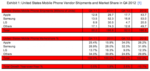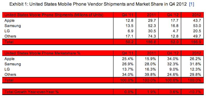 Depuis la sortie du premier iPhone du nom, c’est le premier trimestre qu’Apple arrive en tête des ventes de téléphones mobiles aux USA. Je pense pas que ça soit idiot, sortie de l’iPhone 5 ou non.