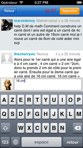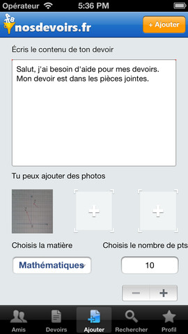 A l’ouverture de l’application, vous arrivez sur un fil d’actualité retraçant toutes les dernières demandes. Comme il s’agit d’un site coopératif, il est fortement conseillé de consulter ces dernières et d’offrir votre aide si cela est possible. L’application fonctionne entièrement à partir du site NosDevoirs.fr. Pour obtenir de l’aide, il suffit simplement de toucher l’onglet « Ajouter », de choisir la matière où l’on est en difficulté, puis d’écrire un message indiquant pourquoi on a besoin d’aide, et l’énoncé qui va avec cette demande. Fait très appréciable, il est possible d’ajouter des photos (pratique lorsqu’il s’agit d’un DM de maths avec des formules compliquées par exemple).