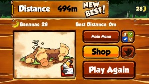 La seule chose que l’on pourrait reprocher est la difficulté, assez prononcée ! Difficile de réellement devenir addict puisqu’il faut faire plusieurs parties pour accumuler assez de bananes pour acheter les améliorations. Et celles-ci sont particulièrement chères ! Du coup, on stagne assez longtemps. C’est frustrant dans l’ensemble. Le secret est de persévérer. Je l’ai fait et le résultat est fructueux. Après je ne sais plus combien de parties, j’arrive enfin à faire des scores corrects et ramasser des tas de bananes.
