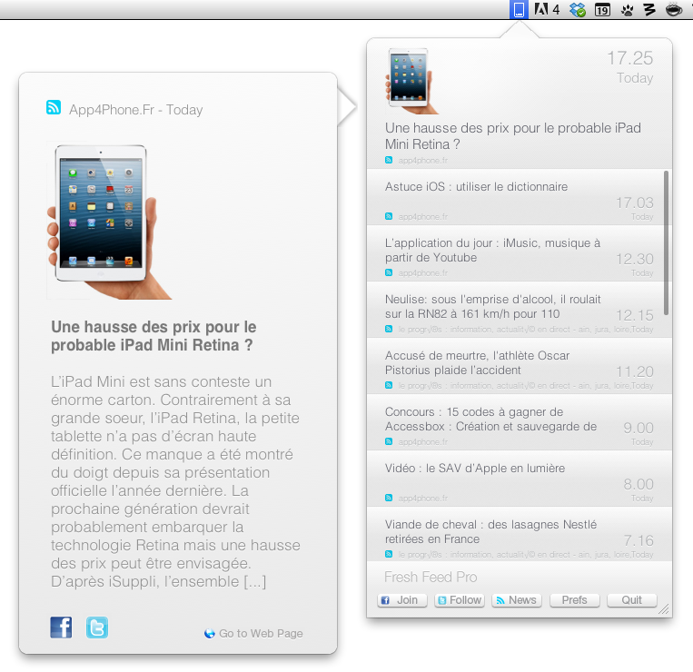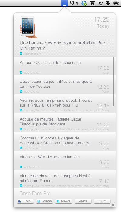 Il est vrai qu’aujourd’hui, avec des services comme Twitter, on est vite au courant de la moindre news intéressante. Plus qu’à cliquer sur le lien en raccourci et hop, on débarque sur l’article et on est informé dans le moindre détail. Néanmoins, je suis peut-être un peu « vieux jeu » (mais je suis sûre que je ne suis pas la seule dans ce cas-là!) et j’utilise encore les flux RSS. Pour la simple et bonne raison que des fois, on a ses sites favoris, ceux qu’on consulte tout le temps, dont on veut connaître le moindre article, ou encore que l’on veut se créer « sa » page web rien qu’à soi, avec tout ce qu’on aime. Fresh Feed Pro se pose plutôt en complément, car il ne remplacera pas votre agrégateur RSS favori à proprement parler: il s’agit simplement d’une icône venant se nicher dans votre barre de menu vous permettant de consulter à tout moment les derniers flux de vos adresses préférées.