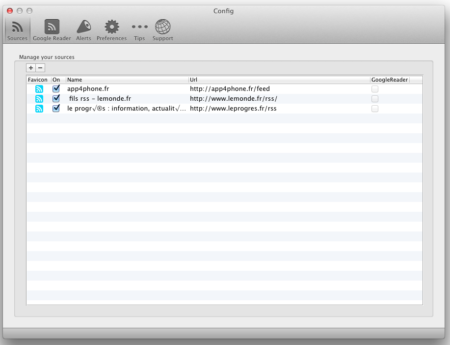 Dans les préférences, vous pourrez gérer vos différents flux. Pour cela, plusieurs solutions: vous pouvez les ajouter manuellement au sein de l’app (en ajoutant directement le lien), ou bien relier votre compte Google Reader, avec un import automatique.