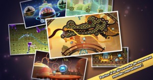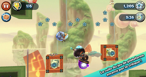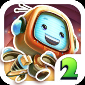 Vous incarnez une petite bestiole avec une TV à la place de la tête, chargée d’aider une ville à s’en sortir en luttant contre les méchants, tout en utilisant de nombreux points d’appuis, ressorts, balanciers, et autres astuces vous permettant de parcourir toute la carte. On retrouve le principe des jeux de plateforme/puzzle, un peu à la Mario: sauf qu’ici, on ne récupère pas des pièces mais des « rouages », qui font office de monnaie du jeu, et des éclairs (cachés dans les recoins des niveaux). Vous ne jouez qu’avec 4 boutons virtuels: les deux premiers servent à vous déplacer d’un côté ou de l’autre, le bouton rouge vous permet de sauter, et enfin un bouton vert fait office de « fourre-tout », vous permettant d’activer les balanciers ou d’utiliser les téléporteurs par exemple. Toutes ces commandes sont bien placées sur l’écran et ne gênent par conséquent aucunement la visibilité du jeu. La difficulté n’est pas énorme (en tout cas dans les premiers niveaux): cependant, les niveaux sont assez vastes, et il faudra donc explorer les moindres recoins du jeu (parfois cachés par de faux murs) pour découvrir tous les éclairs. De plus, pour remporter les 3 étoiles propres à chaque niveau, vous devrez finir le niveau, récupérer tous les éclairs, mais aussi faire tout cela en un minimum de temps (moins de 3 minutes pour les premiers niveaux): autant dire que vous allez devoir refaire les niveaux plusieurs fois pour y parvenir!