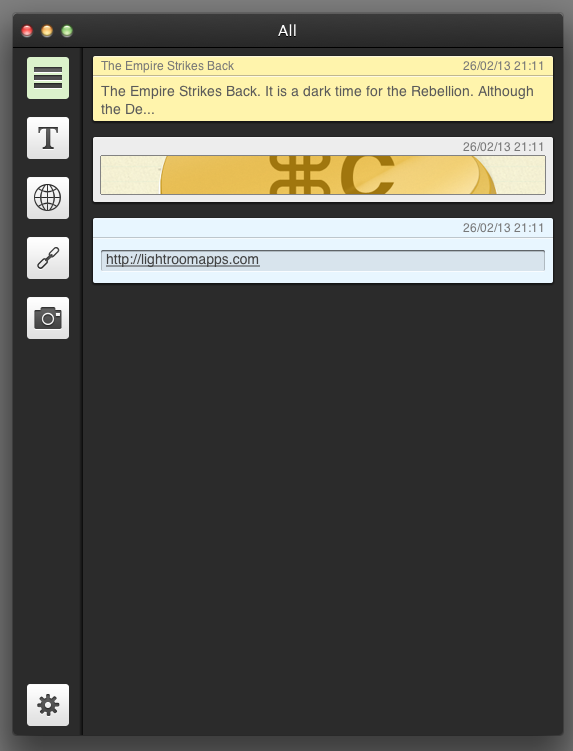 L’application se charge de ranger automatiquement vos copier/coller dans 4 catégories: texte, web clips, liens, et enfin photos. Bien sûr, un onglet « Tous » vous permet de retrouver l’ensemble de vos données, mais il s’avère pratique de pouvoir rechercher plus précisément selon le type. Seul petit regret: pas de fonctionnalité « Recherche » pour le moment, ce qui aurait pourtant pu s’avérer fort utile!