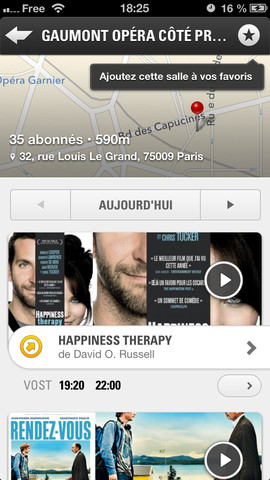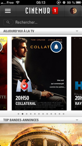 Cinémur vous permet en effet de suivre la diffusion de nouveaux films au cinéma, mais également leur passage à la télévision. Ainsi verrez-vous à l’ouverture de l’application une rubrique « Aujourd’hui à la TV » vous permettant de voir en un clin d’oeil les meilleurs films du jour, la chaîne sur laquelle ils sont diffusés et l’heure. Mieux encore: si vous prenez le temps de lier votre iPhone à votre télévision, vous pourrez l’utiliser comme télécommande. A l’heure de la diffusion, une petite icône en forme de télévision s’affichera, et vous n’aurez qu’à la toucher pour lancer la chaîne. Pour l’instant, cela ne marche qu’avec la Freebox (chez Free, ils ont vraiment tout compris), mais les développeurs ont indiqué travailler sur l’intégration d’autres box. Enfin, si le film n’est pas encore diffusé, vous pourrez tout de même utiliser une icône en forme d’alarme pour avoir un rappel 10 minutes avant le film ou encore enregistrer le film dans votre liste de films à voir.