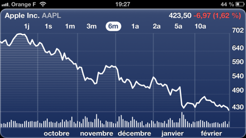 Si l’action d’Apple chute, c’est à cause de la mort de Steve Jobs. Les spéculateurs se demandent si Apple pourra conserver son leadership sans son gourou. Apple, c’était Steve Jobs. Et tant que Steve Jobs était là sa seule présence suffisait à faire monter les cours d’Apple. C’est pourquoi il ne distribuait jamais de dividendes, puisque on ne pouvait pas faire de pertes sur ses actions. Mais maintenant que la bourse est déjà effrayée par le futur d’Apple, la moindre rumeur suffit à faire plonger les cours. C’est la bourse, comme au casino.