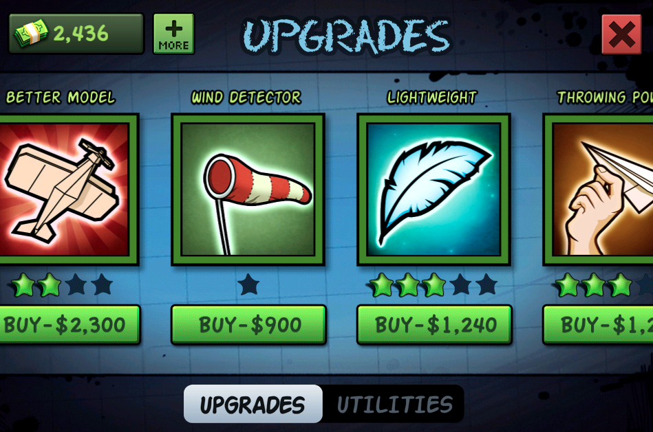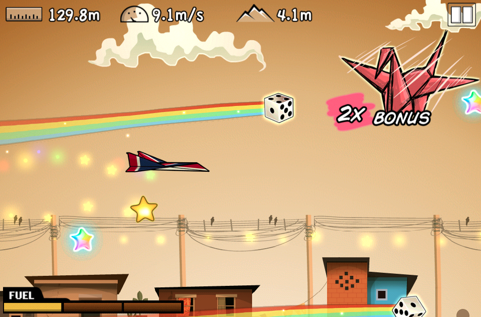 Le but du jeu ensuite est simple. Une fois votre avion en vol, vous devrez aller le plus loin possible en récoltant des étoiles qui feront guise de dollars, vous permettant ensuite d’acheter divers pouvoirs ou améliorations (à la manière de Temple Run, Lane splitter ou bien le très bon Ski safari) afin d’améliorer votre distance et votre avion. Vous devrez parcourir un certain nombre de mètres dans chaque ville avant de passer à la suivante.