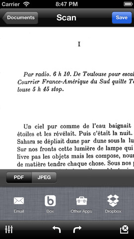 Une fois que votre document est prêt, vous choisissez son format (JPEG ou PDF) et il ne vous reste plus qu’à l’enregistrer dans vos photos et/ou de l’envoyer par mail. Il est possible de le partager via Facebook ou Twitter. Les options permettent d’ajouter un Tag à votre document pour le nommer.