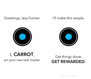 Bon, j’aime bien les apps en noir et blanc parce que ça fait classe et que c’est sobre. Peut-être un peu trop ici. L’application se veut futuriste, elle l’est. D’ailleurs, on a pu voir que Carrot était condescendante avec nous et qu’elle pouvait se fâcher ! Quand cela fait plusieurs jours que vous n’avez pas consulté l’app ou que certaines de vos tâches ne se font pas, l’oeil de Carrot devient rouge ! (ne dites surtout pas que je vous l’ai dit, sinon elle va me tomber dessus !)