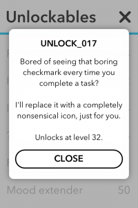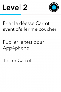 Déjà fini ? Vous étés donc arrivé au niveau 2 ! Toutes mes félicitations…Car oui, il y a des niveaux ! Et vous obtenez des récompenses. Mais encore une fois la condescendance de Carrot se fait sentir, ah la vilaine ! Voici ce qu’elle ose me dire : « Vous êtes arrivé au niveau 2 ? Pardonnez ma surprise. Sans supervision directe, je pensais que tu serais juste assis là à baver stupidement. Bien, vous avez mérité votre première récompense : le don de la connaissance. Êtes-vous prêt ? » Plutôt mal élevée cette Carrot ! Et votre première récompense est un code binaire, ce qui signifie lamantins. Euh merci ? Bref, continuons notre petit tour. Ajoutez une nouvelle tâche en slidant vers le bas. A chaque fois que vous effacerez une tâche, vous gagnerez des points pour monter de level ! Dirigeons-nous vers le menu. Je vais vous laisser farfouiller un peu par vous-même.