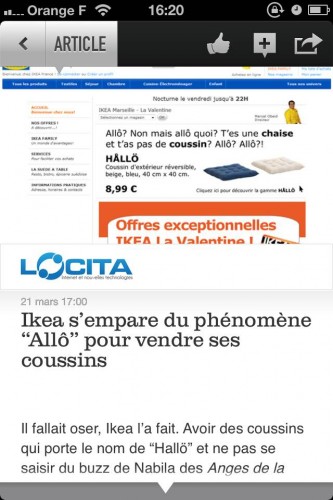 Cette application se démarque des autres du même types sur différents points : un moteur de recherche intelligent, un classement des actualités par « magazines personnels », une UNE (l’édito) toujours très claire et bien ficelée. De plus, en un glissement de doigt vers le haut de l’écran vous aurez accès à la source de l’article.