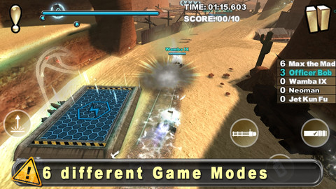 Pour le début, le jeu vous propose un tutoriel. Les commandes sont assez simples: utiliser l’accéléromètre pour tourner, appuyer sur un bouton pour sauter, utiliser le point d’exclamation lorsqu’on s’est « perdu » pour revenir dans le bon chemin. On retrouve également un système d’objets bien pratiques pour gagner: un pack de NOS pour bien sûr avancer plus vite (comme dans tout bon jeu de course qui se respecte!), mais aussi une arme vous permettant de dégommer vos adversaires. Vous pouvez aussi drifter en effectuant un saut et en tournant à l’arrivée de celui-ci. Enfin, pour recharger votre barre d’énergie en haut de l’écran, vous devrez passer par les petits ronds lumineux.