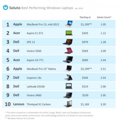 Une étude a été menée par Soluto et porte sur la fiabilité des ordinateurs portables où Windows y est installé. A la grande surprise générale, l’ordinateur qui arrive en tête de cette étude à une pomme luminescente sur le capot. Le MacBook Pro où Windows y est installé via BootCamp surclasse ainsi toutes les autres modèles d’ordinateurs portables.
