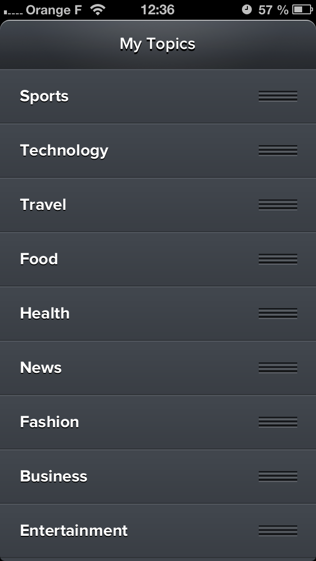 - et enfin, My Topics: C’est ici que vous personnalisez votre information en classant vos sujets dans un ordre préférence. Il vous est possible de cliquer directement sur le topic voulu pour y voir l’actualité qui lui est réservé. Simple et efficace.