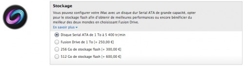 En effet, en vous connectant sur le site d’Apple, lors de l’achat d’un iMac, plusieurs possibilités s’offrent à nous ; conserver un Disque Serial ATA de série à 1 To de stockage, passer à un Fusion Drive de 1 To de stockage (250 euros en sus) ou encore opter pour le stockage flash de 256 ou 512 Mo (en comptant respectivement 300 ou 600 euros en sus). Cela permet aux iAcheteurs de largement personnaliser leur machine selon leur utilisation.